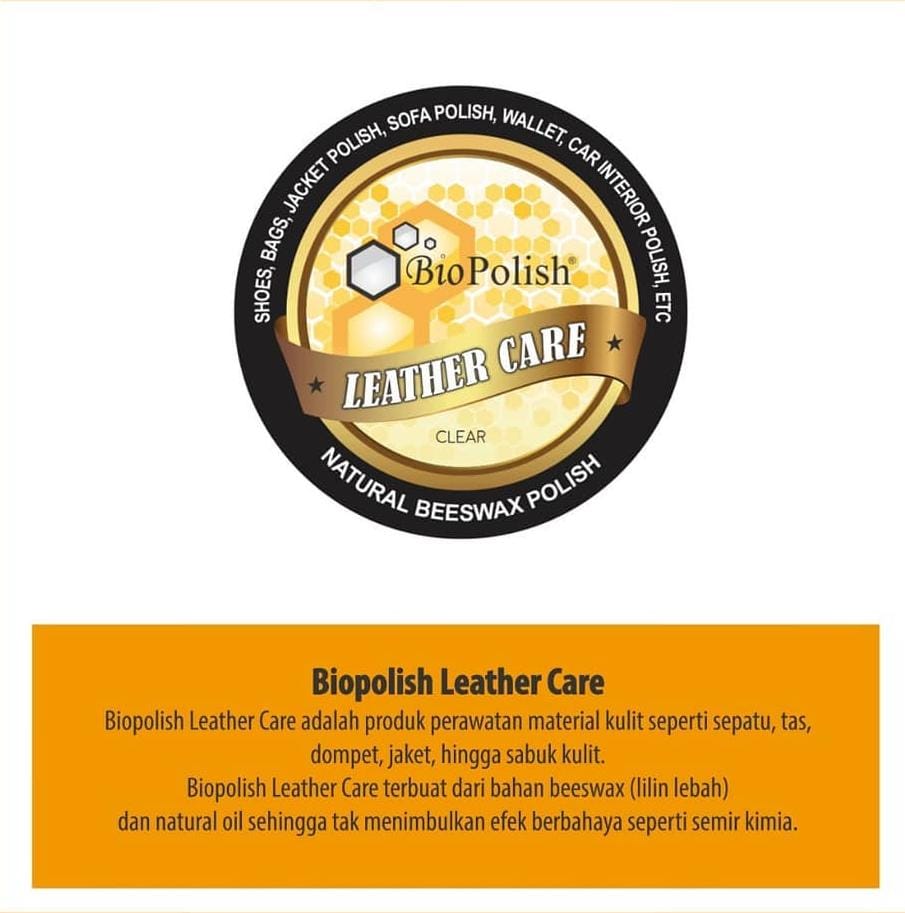 Biopolish Leather Care adalah produk perawatan material kulit seperti sepatu, tas, dompet, jaket, hingga sabuk kulit. Biopolish Leather Care terbuat dari bahan beeswax (lilin lebah) dan natural oil sehingga tak menimbulkan efek berbahaya seperti semir kimia.