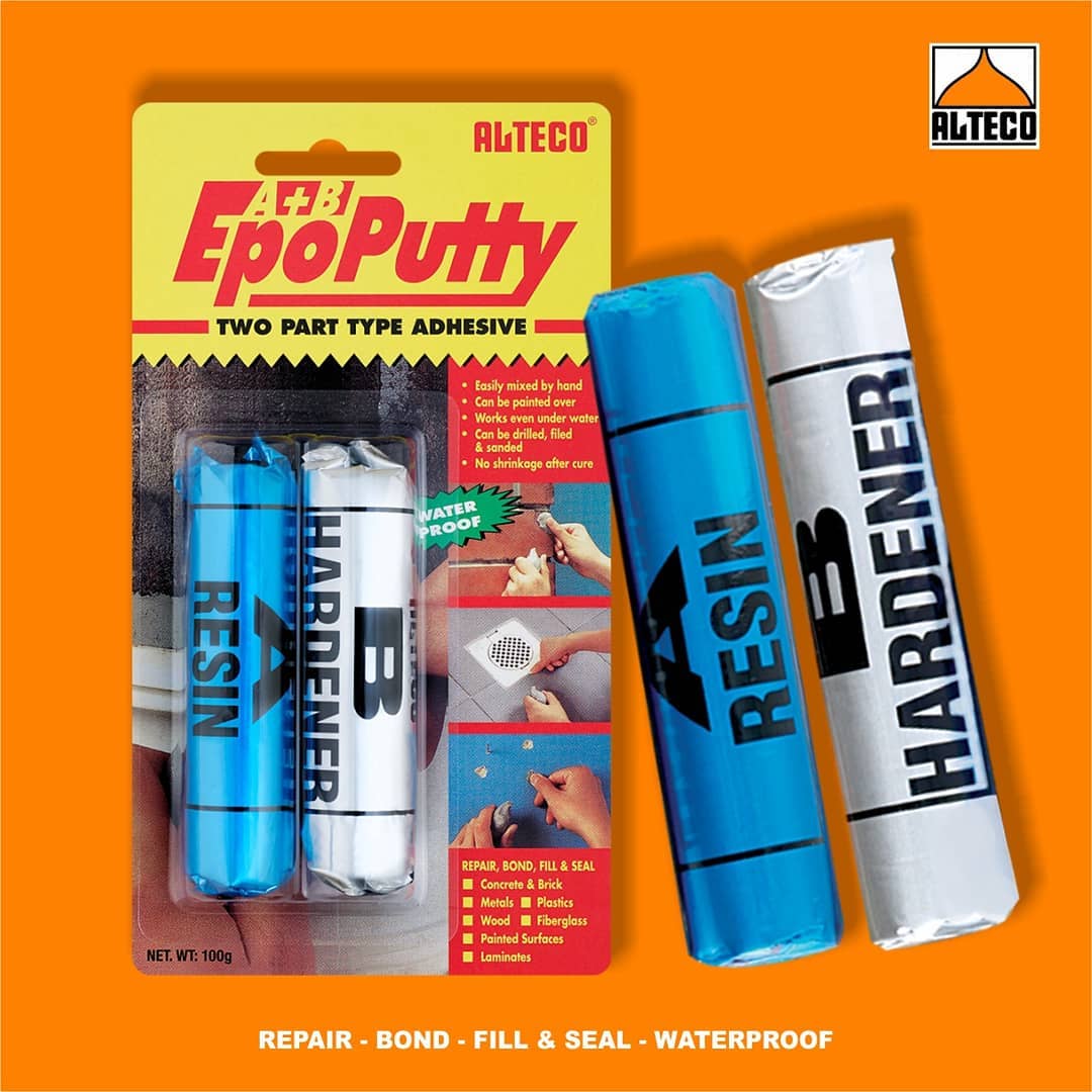 Epoputty ini terdiri dari resin dan hardener, yang ketika dicampur dapat mengeras, menambal bagian yang berlubang secara sempurna. Dapat diaplikasikan pada fibreglass, metal, PVC, plastik, kayu, dan hampir seluruh permukaan lainnya. Bisa juga di aplikasikan pada permukaan yang basah maupun kering. Ketika Epoputty kering, hasilnya tambalan akan mengeras, tahan panas ketika dibakar, dan tahan terhadap bahan kimia. Ada Alteco Epoputty, gak takut bolong lagi. ALTECO original Japan Glue.